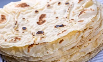 - Těsto rozdělte na 8 stejných dílů, každý o hmotnosti přibližně 100 g, rozválejte na tenký plát a smažte na obráceném vyhřátém plechu z obou stran, jak je uvedeno ve videu.